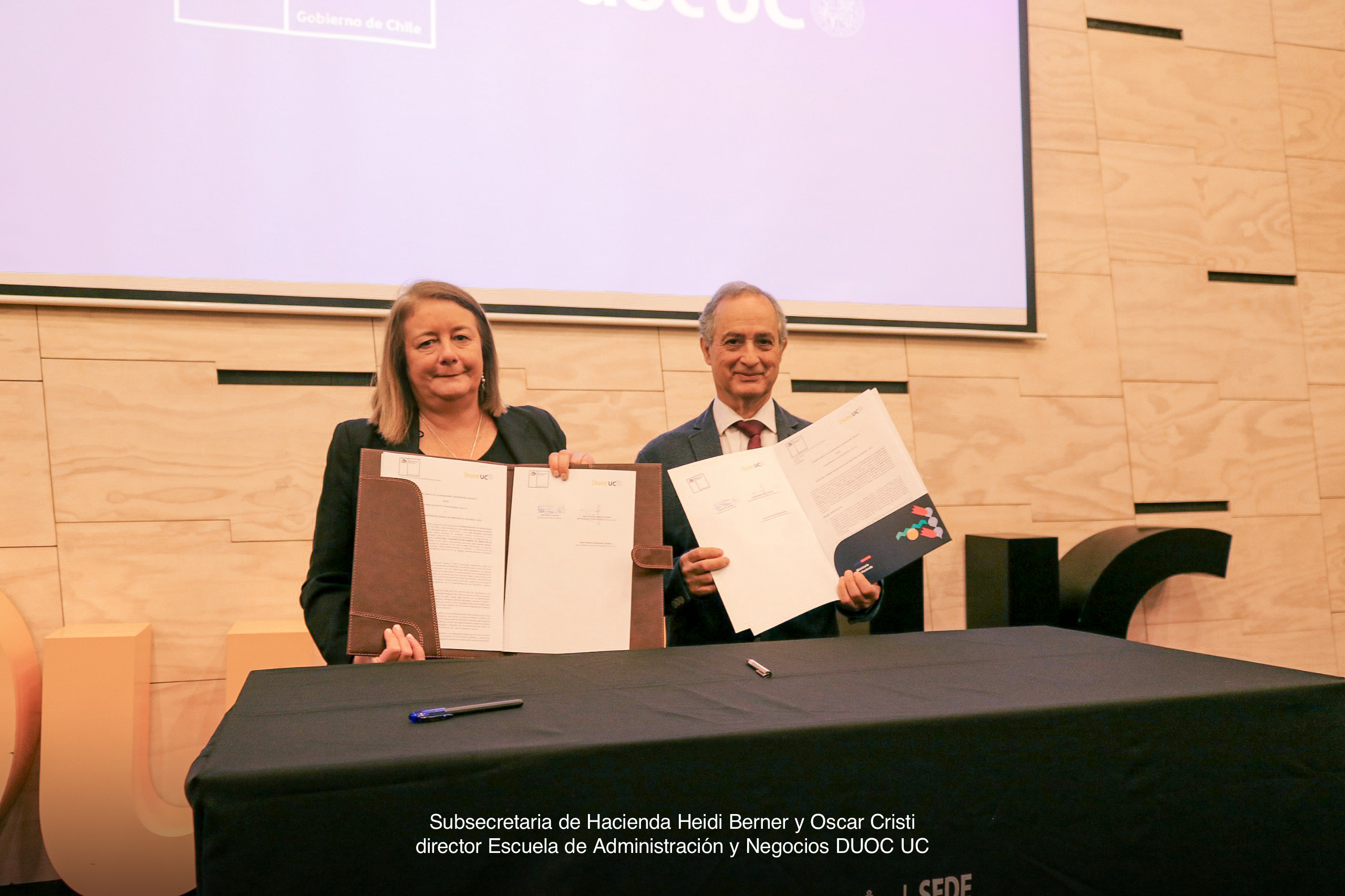 Durante el evento se firmó un convenio de colaboración entre el Ministerio de Hacienda y DUOC UC para fortalecer la vinculación entre el ecosistema digital de comercio exterior y la formación técnico-profesional, generando oportunidades de capacitación y desarrollo de talento especializado para el sector logístico.